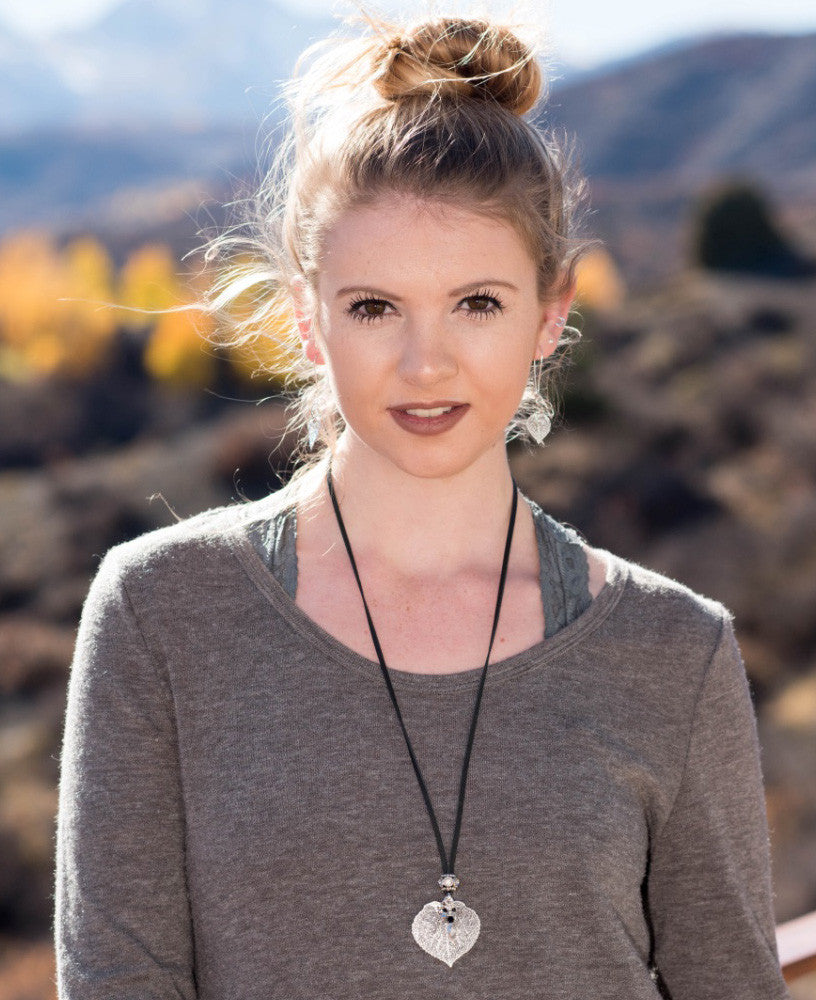 Single Aspen leaf, black deerskin leather, embellished with a crystal-studded bead and crystal dangles